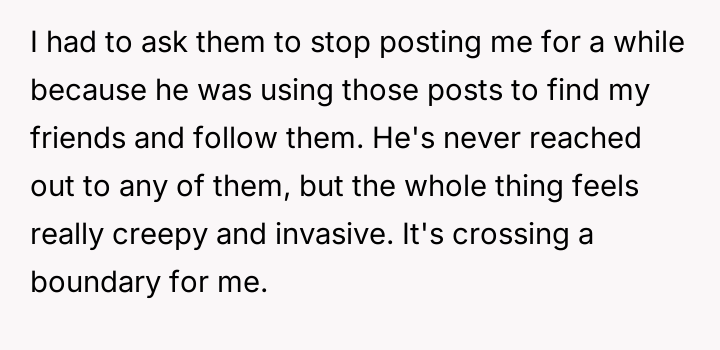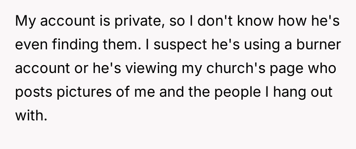 The OP's actions in protecting her social circle, including asking friends to limit social media posts, are appropriate responses to invasive behavior, which is compounded by her mother’s unhelpful bias. Moving forward, the OP should communicate clearly that all discussions must be strictly limited to the baby's care. If the ex-partner continues to cross these lines or engage in surveillance, establishing communication solely through a monitored co-parenting app may be necessary to create an objective, documented record.