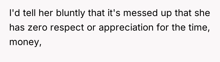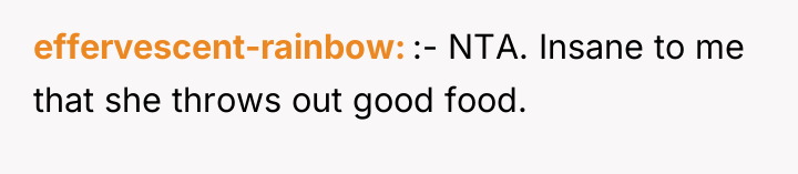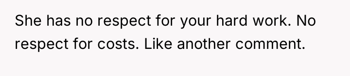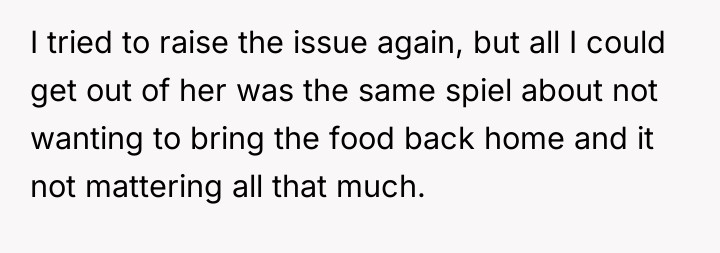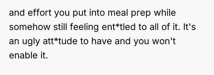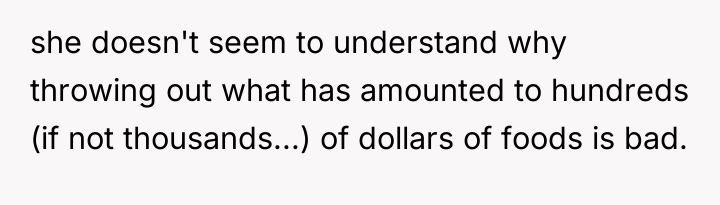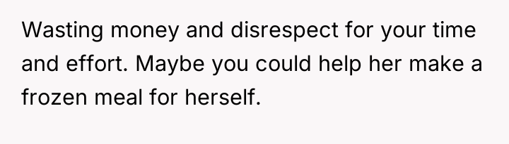 The wife’s actions demonstrate a profound lack of consideration for her husband’s emotional labor and financial contribution. Meal prepping is an act of service; repeatedly discarding the prepared meals signals that she does not value the effort involved. Her dismissiveness about the cost and her refusal to store or consume the food indicate a failure to recognize the partnership aspect of shared household responsibilities. The husband’s response, while emotionally understandable—a direct withdrawal of the service—escalated the situation from a discussion about waste into a conflict about control and respect. Cutting her off entirely, rather than setting a firm boundary about future prep (e.g., "I will only prep for you if you commit to eating it"), felt punitive to the wife, leading to her anger.
