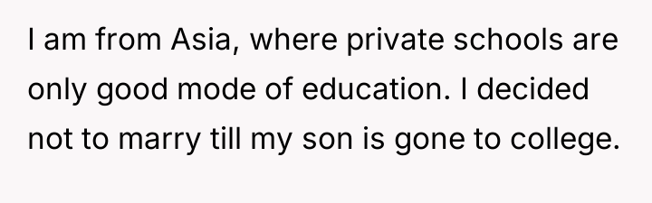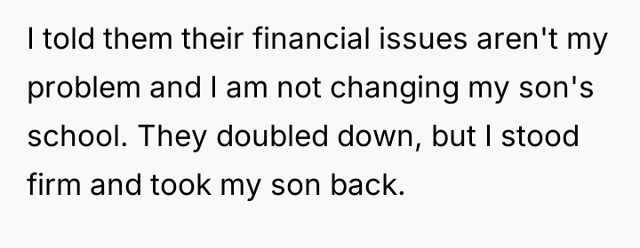 The original poster (OP) is fiercely protective of their son's educational path, viewing the current private schooling as essential and non-negotiable, especially given their financial ability to provide it. The central conflict arises when the ex-partner and new spouse attempt to dictate a change in the son's schooling based on the financial constraints of the new blended family, directly challenging the OP's established arrangement and parental autonomy.