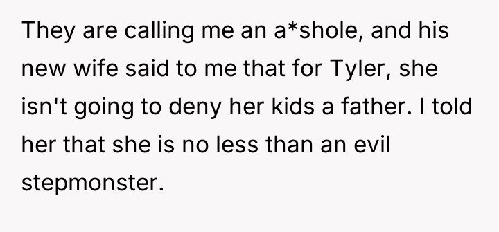 The OP's reaction, while emotionally charged (calling the stepmother an "evil step monster"), was appropriate in firmly defending the son's current school placement. A more constructive approach in future conflicts would be to clearly communicate that while they respect the ex-partner's financial constraints regarding their other children, those constraints do not override the established, fully funded plan for Tyler. Future discussions should focus strictly on co-parenting logistics for Tyler, rather than attempting to align the educational outcomes of children from separate households.
