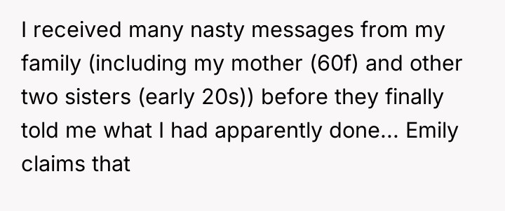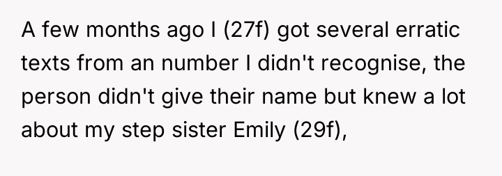 The original poster (OP) acted out of genuine concern for their step-sister's safety after receiving alarming, anonymous texts, leading to an unexpected and severe backlash from their family, who now accuse the OP of harassment based on the step-sister's claims. The core conflict lies between the OP's protective, albeit indirect, action and the family's decision to immediately side with the sister, resulting in the OP feeling isolated, heartbroken, and forced to create distance for their own well-being.