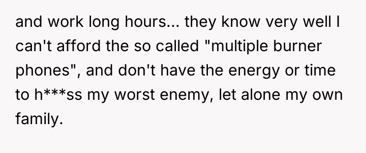 The situation presents a classic example of fractured communication and a failure to verify critical information before escalating conflict. The OP’s initial action—calling emergency services for a wellness check—was a reasonable response to texts suggesting self-harm, especially considering the distance. However, the family’s immediate leap to accusation, based solely on the sister's assertion that the OP used burner phones, bypasses basic logic, especially given the OP’s stated financial constraints. The sister's reported action of 'baiting' the supposed harasser suggests a potential underlying issue or a manipulation tactic that the family appears unwilling to critically examine. The family’s focus on the OP’s absence from Christmas demonstrates a pattern of prioritizing emotional obligation over supporting a member who has been unjustly accused.