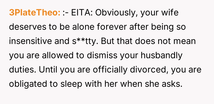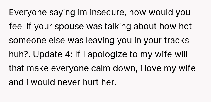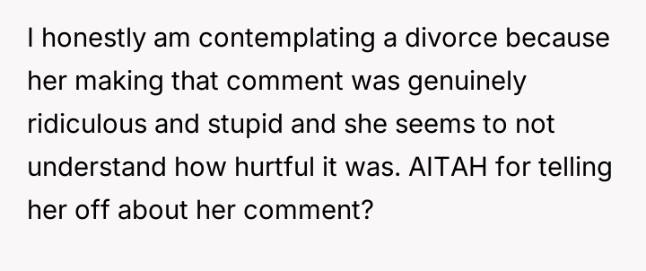 In my opinion, this situation underscores the importance of mutual respect and sensitivity in a relationship. A single insensitive remark, especially when it touches on attraction and fidelity, can cause significant damage if not addressed promptly and honestly. Rather than rushing into divorce, the couple might benefit from a heartfelt conversation or even couples counseling to explore their feelings and rebuild trust. After all, every marriage faces bumps, but how they navigate them often determines their future together.