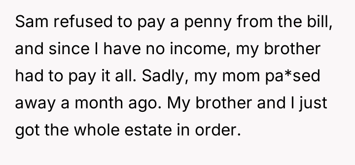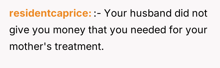 She had sacrificed her career and independence, trusting her husband’s promise of security, only to find herself powerless when her mother fell ill. With no income and a husband unwilling to share the burden, she watched helplessly as her brother bore the cost of care, all while she grappled with the loss of the woman who raised her.