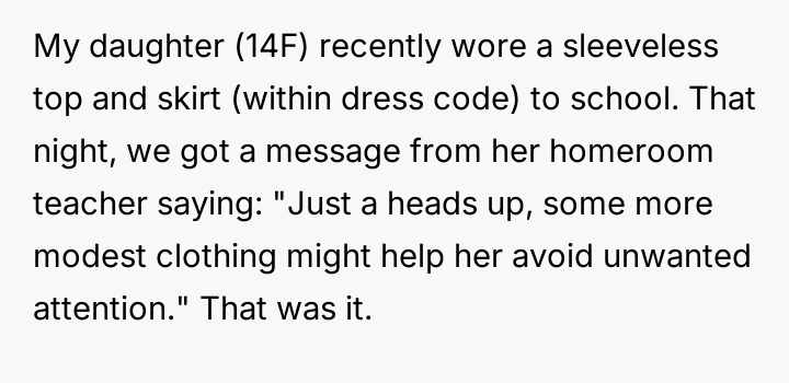 A mother’s heart shattered as her teenage daughter was subtly blamed for simply wearing clothes that were perfectly within the school’s dress code. Instead of support or guidance, she received a cold message implying her daughter’s appearance invited “unwanted attention,” igniting a fierce fire of protection and rage within her.