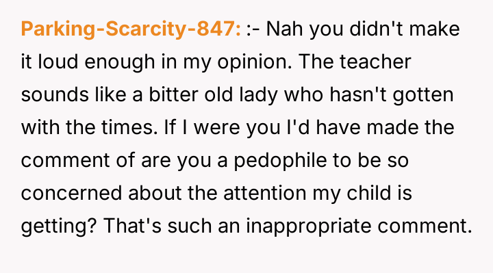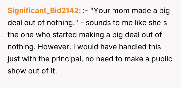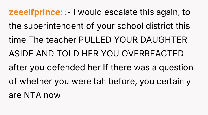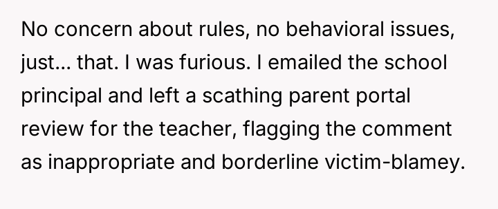 The core conflict here involves a failure to establish or respect emotional and professional boundaries. The teacher’s comment, while perhaps stemming from an 'old-school' concern about appearance and attention, subtly shifts responsibility onto the 14-year-old student for potential external reactions, which is a form of victim-blaming communication. The OP’s furious response, involving a scathing review and direct email to the principal, demonstrates an intense drive to protect their child from perceived injustice, but the method—public and immediate escalation—breached the typical boundary of professional communication between parents and staff. This over-the-top reaction may have caused the exact embarrassment the OP sought to prevent when the teacher later minimized the incident to the daughter.