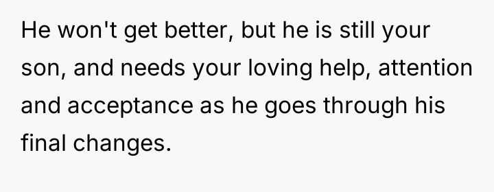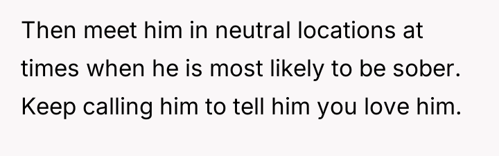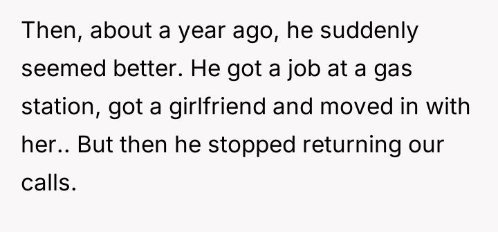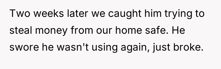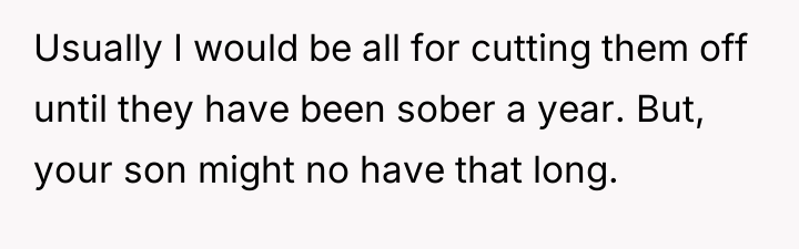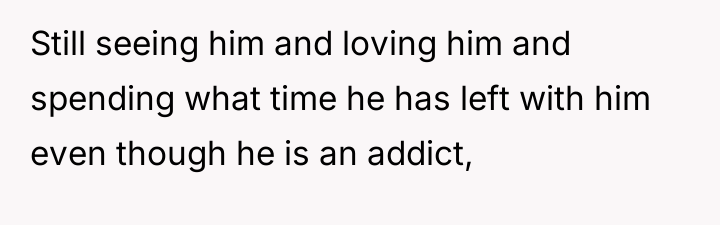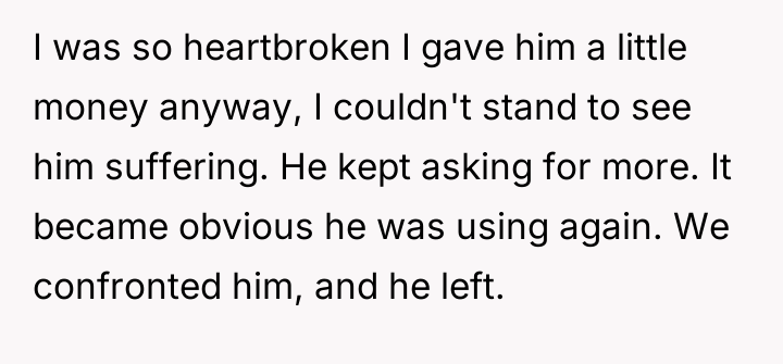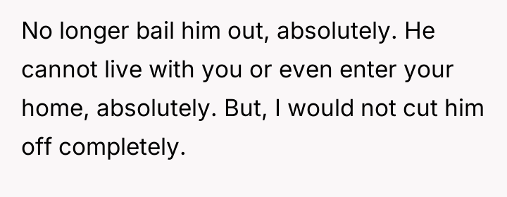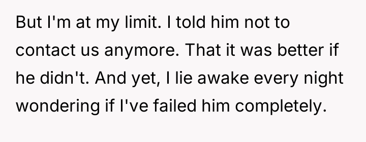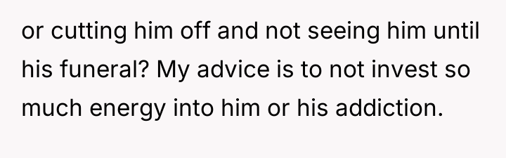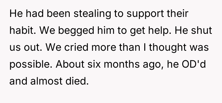 The mother’s decision to cease contact is an appropriate, albeit painful, step towards establishing critical boundaries. Professional recommendation centers on the family seeking specialized support—not just for the son's addiction, but for the parents' trauma and grief management. Future interactions should be strictly limited to structured interventions, such as involvement with case managers or a mandated treatment program, rather than allowing open-ended financial or emotional access that facilitates further use.