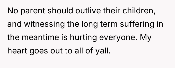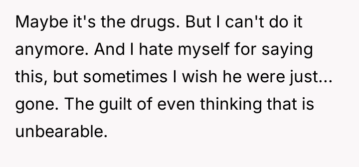 The parent is experiencing profound emotional distress, grief, and exhaustion due to their son's severe substance use disorder, which developed following a devastating brain tumor diagnosis. Their central conflict lies between the unconditional desire to help their suffering child and the absolute necessity of self-preservation after repeated enabling and boundary violations led to further crisis.
