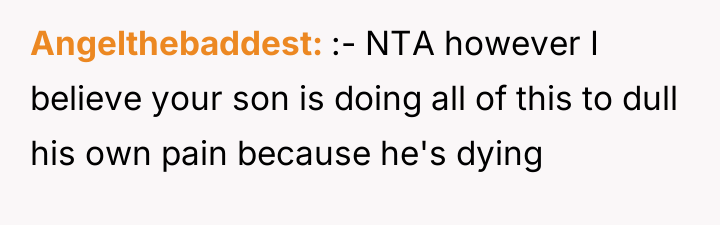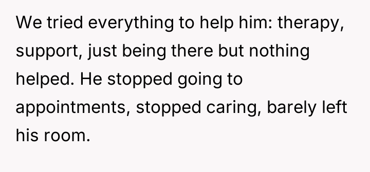 The parents are caught in a classic enabling dynamic, driven by deep love and the immense stress of the son's terminal diagnosis. Their giving of money after discovering theft, despite knowing he was actively relapsing, reinforces the addiction cycle. The son, facing an incurable illness, appears to be coping through self-destruction, manifesting in substance abuse and destructive stealing, which may be a subconscious expression of his despair or a learned behavior pattern reinforced by immediate parental relief. The mother's acknowledgment of suicidal ideation regarding her son highlights the toxic emotional toll this situation has taken on the entire family unit.