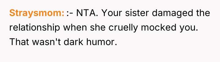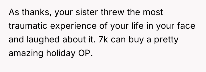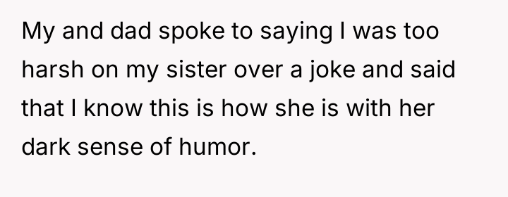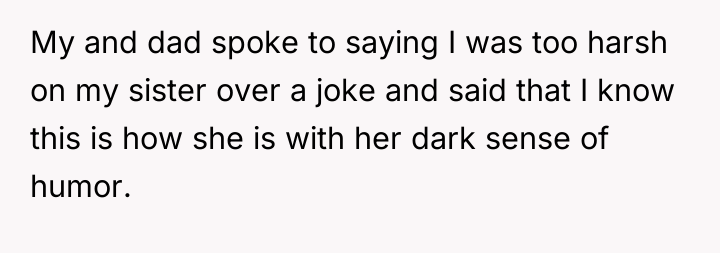 In my opinion, this story is a powerful reminder that even in our darkest moments, we can find ways to uplift those around us. The sister’s laughter and comment at dinner, while tinged with a bit of humor and fear, underscore the lingering impact of trauma but also the importance of solidarity and hope. Ultimately, this story is about healing, family bonds, and the courage to move forward—lessons that resonate beyond the original poster’s personal experience.