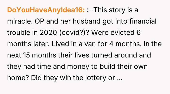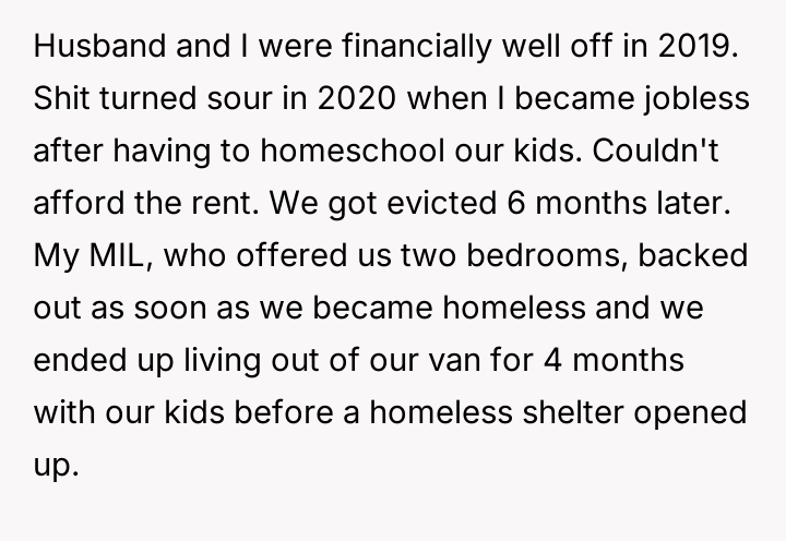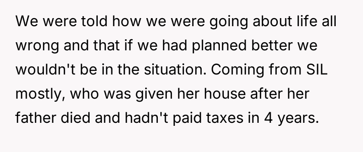 After reading through the Reddit comments, it’s clear that many empathize deeply with the OP’s struggle, highlighting how quickly life circumstances can change and how important compassion within families really is. The overwhelming consensus supports the idea that financial hardship doesn’t define a person’s worth, and the lack of support from close relatives only made the situation more painful. Many commenters praised the OP and their family for their resilience and determination to rebuild their lives despite the harsh setbacks.