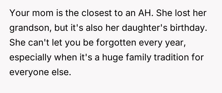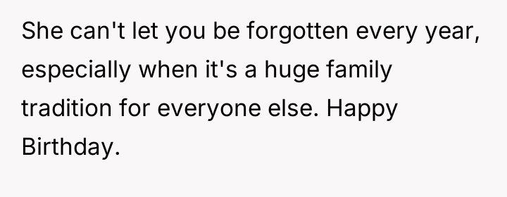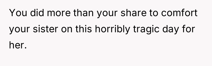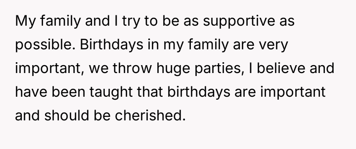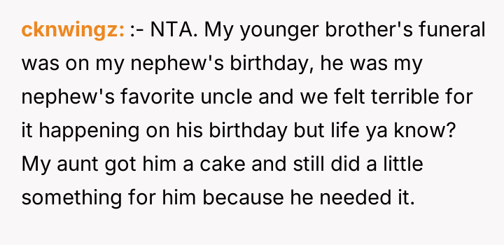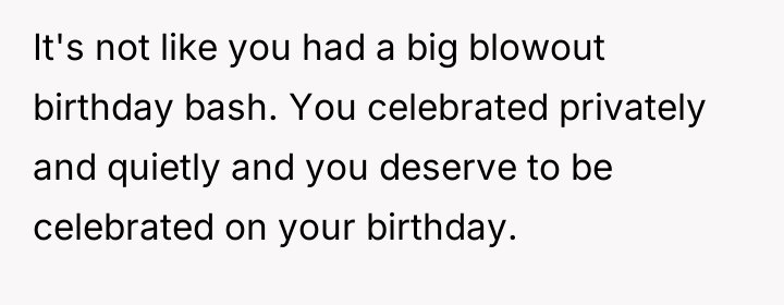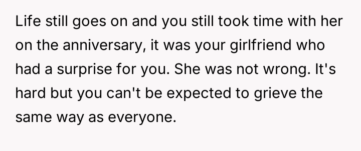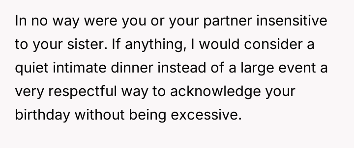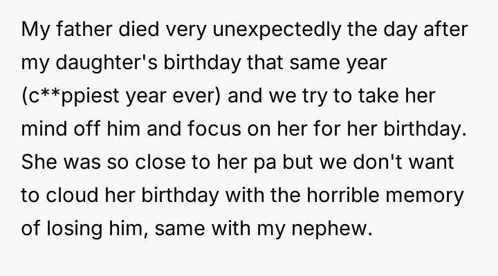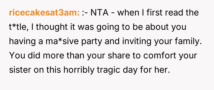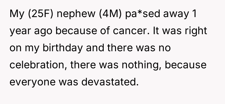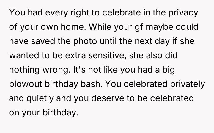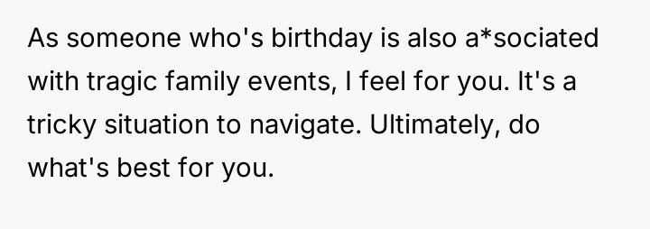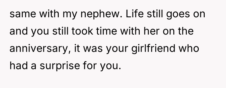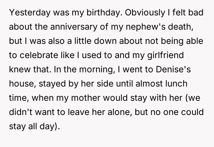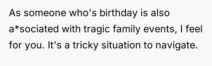 After reading through the Reddit comments, it’s clear that many people empathize deeply with the author’s complex emotions surrounding their birthday. The loss of a young family member, especially on a day traditionally meant for celebration, creates a difficult mix of grief and missed joy. Commenters appreciate the author’s sensitivity in balancing support for their sister’s healing process while also acknowledging their own need for comfort and celebration. The intimate surprise from the girlfriend was seen as a thoughtful and loving gesture that helped the author find a moment of peace amid the sadness.