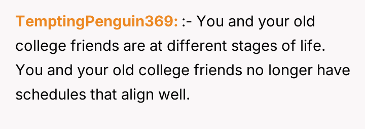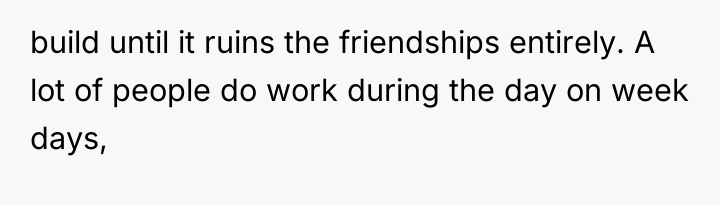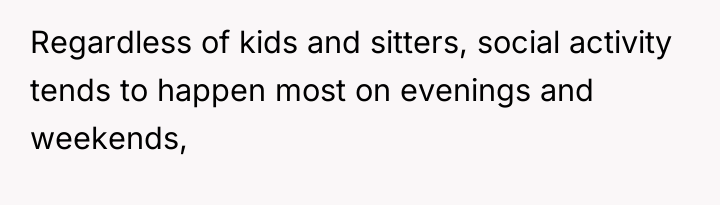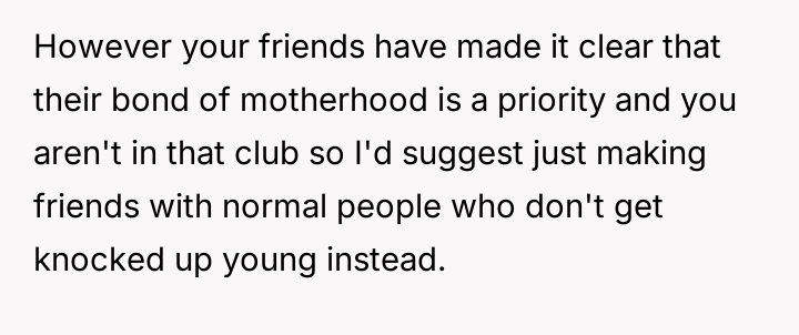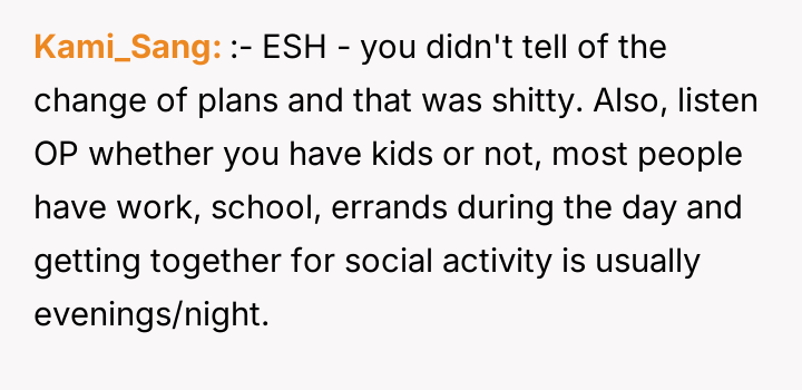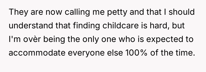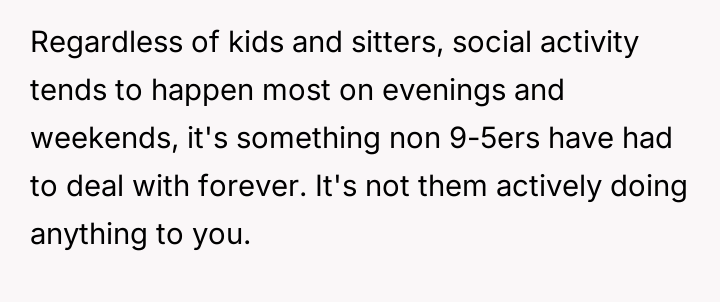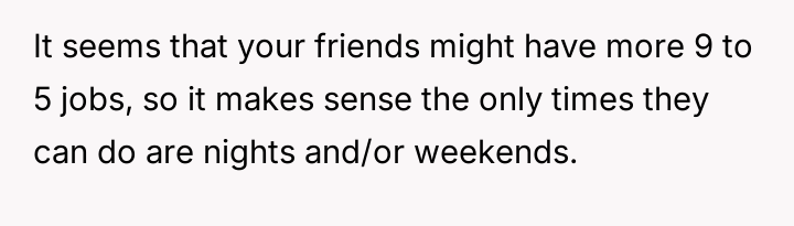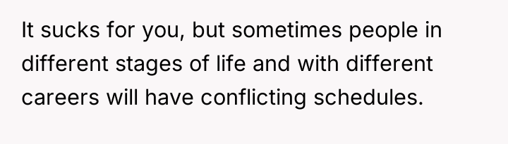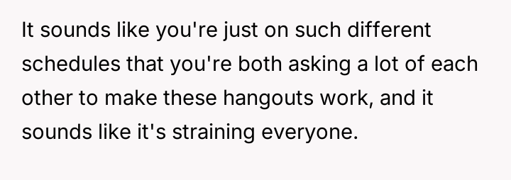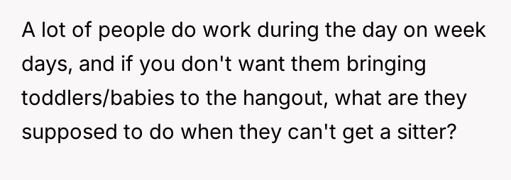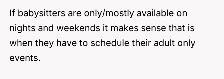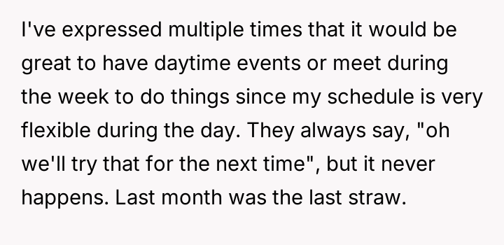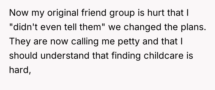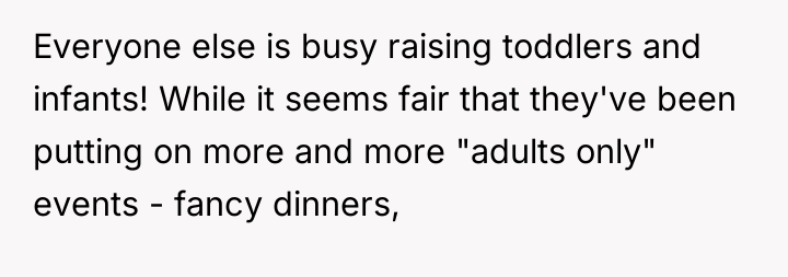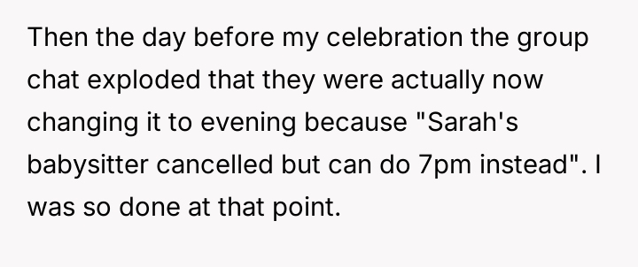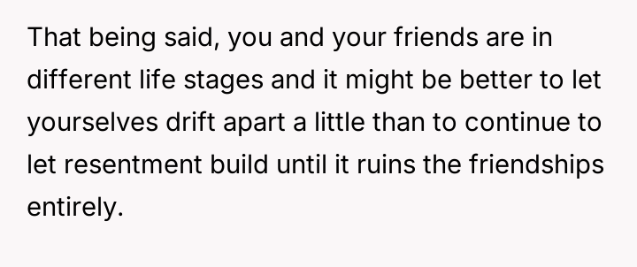 As renowned family therapist Dr. Harriet Lerner explains, “Boundaries are not about controlling other people; they are about taking care of yourself.” The situation described highlights a significant imbalance in emotional labor and logistical accommodation within this friend group. The OP, being the only member without children, has consistently adapted her schedule to fit the group's parental constraints, which are often dictated by the availability of external support (babysitters).