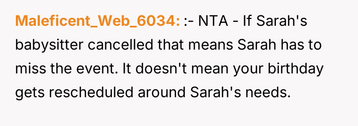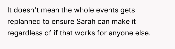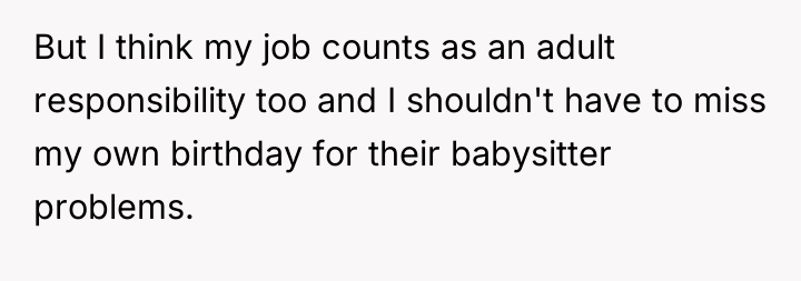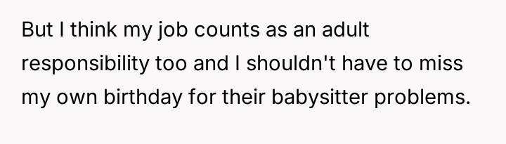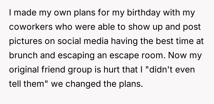 When the group unilaterally changed the OP's birthday plans due to a scheduling conflict for one member's babysitter, it signaled that the OP's needs and the significance of her birthday were secondary to another member's convenience. This repeated pattern invalidates the OP's responsibilities (her job) and her desire for equitable treatment. Her frustration is rooted in feeling like an optional accessory to the group rather than an equal member whose commitment should be respected.