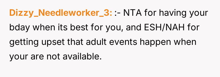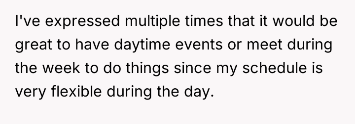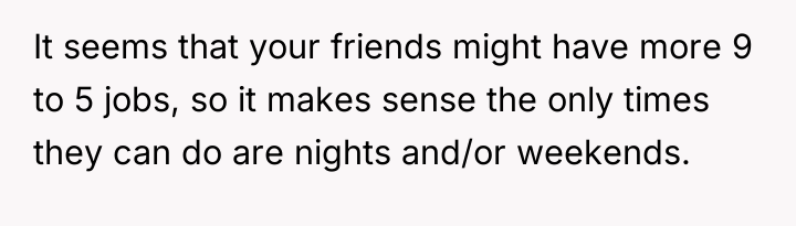 The OP's decision to proceed with her own birthday celebration was an appropriate boundary enforcement action given the repeated failure of communication and compromise. Moving forward, the constructive recommendation is for the OP to initiate a direct, calm conversation focused on scheduling equity. She should propose specific, non-negotiable daytime or weekday slots for group activities, framing it not as an ultimatum but as a necessary condition for her continued participation in the group's social life.