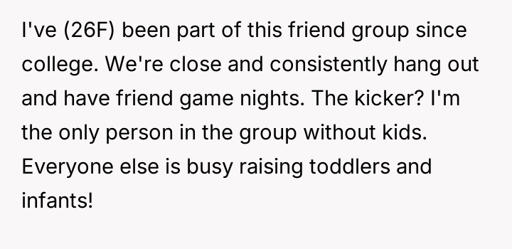 She’s been a loyal part of her tight-knit college friend group for years, sharing laughter and countless memories, yet the growing presence of toddlers and infant cries has slowly edged her out. While her friends have embraced a new chapter filled with “adults only” events tailored around their children’s schedules, she finds herself repeatedly sidelined, her own life’s rhythm overshadowed by their demands.