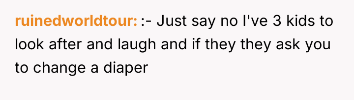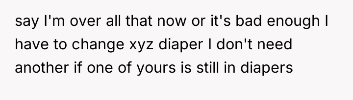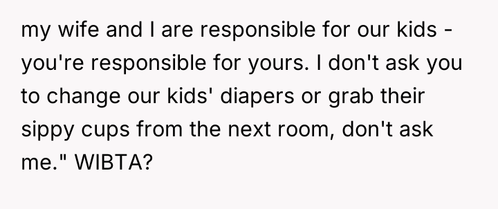 The OP's desire to state, "I don't ask you to change our kids' diapers or grab their sippy cups from the next room, don't ask me," is fundamentally appropriate from a boundary perspective. A constructive recommendation would be for the OP to use 'I' statements focused on his own responsibilities rather than criticizing their parenting. For instance, instead of refusing a request directly, he could respond by saying, "I need to focus on my youngest right now, so I can't help with that," or, "My wife and I handle our own kids' needs, so you'll need to take care of that one."