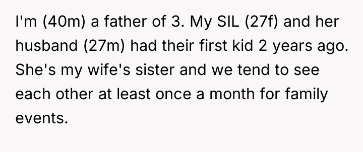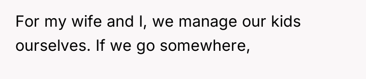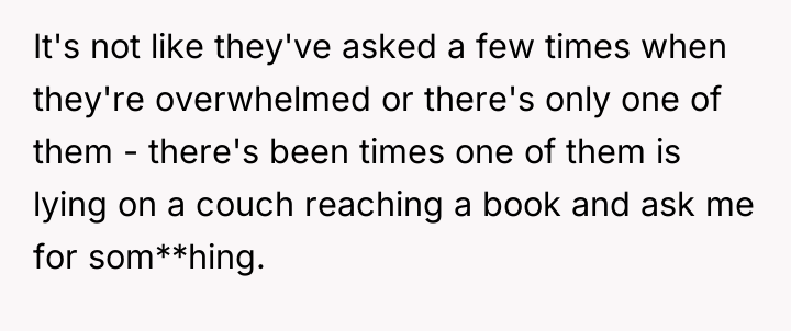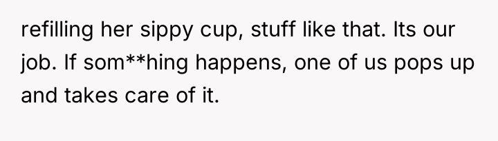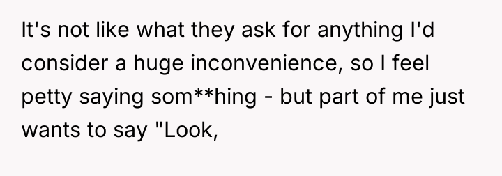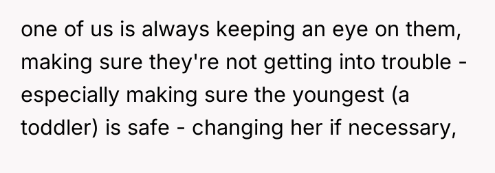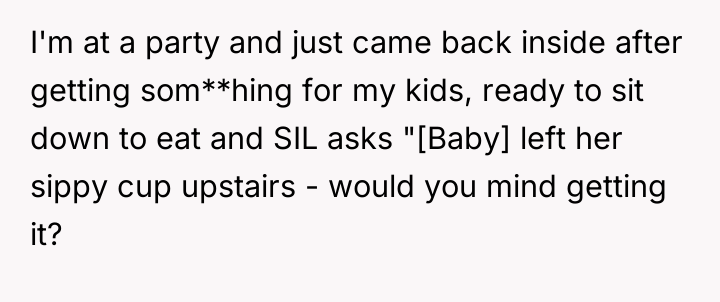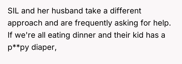 The OP and his wife operate under a clear model of parental ownership: they are fully responsible for their children at all times. The SIL and her husband, however, appear to utilize social settings as opportunities to offload routine parental duties onto available family members. While the tasks requested (retrieving a cup, attending to a diaper) are minor, the *pattern* of asking—especially when both parents are demonstrably idle—signals a lack of respect for the OP's established boundaries and an assumption of available service labor. This can lead to resentment, which the OP is currently experiencing, feeling 'petty' for wanting to enforce his own standards of care onto others' children.