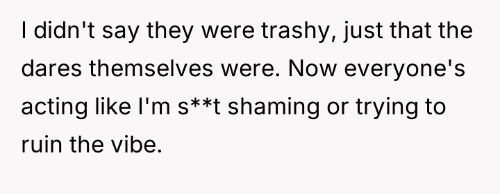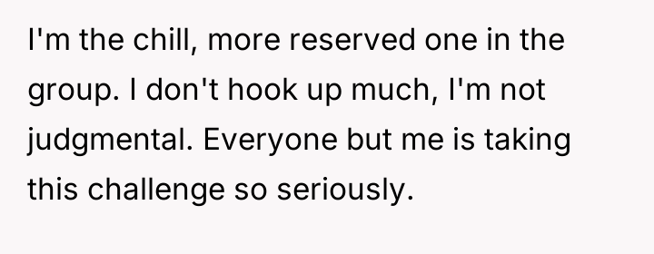 This situation highlights a common conflict between group conformity and individual boundary setting, particularly in young adult social dynamics. The OP initially agreed to a challenge list, signaling a willingness to participate in lighthearted social dares. However, the scope dramatically shifted to activities that violate her personal comfort level regarding sexual expression and risk (such as public hookups or creating explicit media). When the OP expressed that the *dares* were "trashy," she was attempting to set a boundary regarding the group's activities, not judging her friends' personal choices. Her friends' reaction—accusing her of slut-shaming or jealousy—is a deflection tactic often used to maintain pressure and avoid acknowledging that their activity has become coercive or uncomfortable for a member.