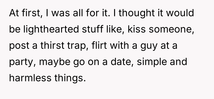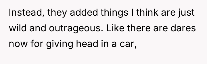 The OP's actions in voicing her concern were appropriate as they defended her personal autonomy. However, the delivery could be refined for future situations. A constructive recommendation is for the OP to clearly state, using "I" statements, that she is opting out of the dares that cross her moral line, rather than commenting negatively on the dares themselves. For example: "I value our friendship, but I am personally not comfortable with dares involving explicit sexual acts, so I will only be doing the less intense challenges." This shifts the focus from criticism of the group to a firm, non-negotiable statement of her own limits.