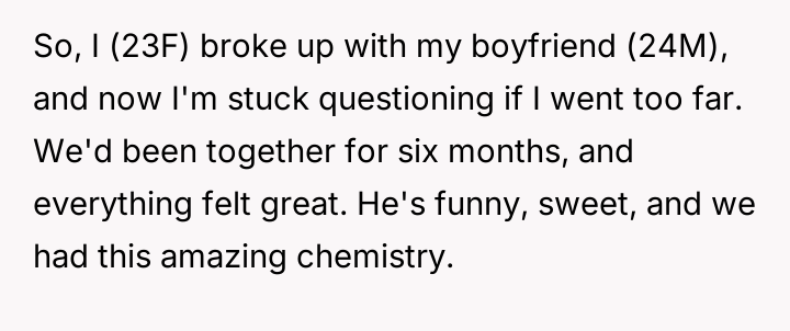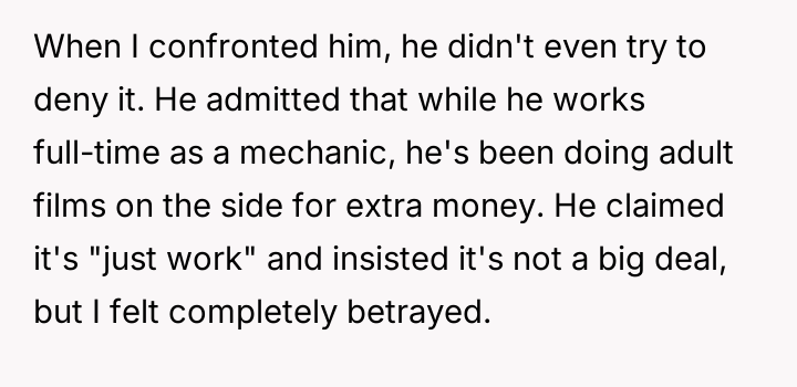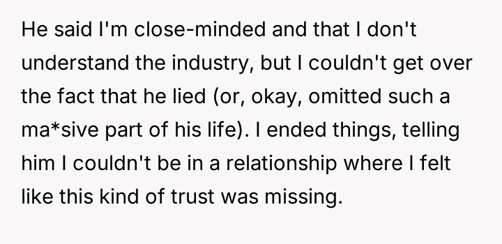 The original poster (OP) ended a six-month relationship after discovering her boyfriend was secretly working in the adult film industry, a fact he had deliberately hidden. Her primary distress stems from the breach of trust caused by this significant omission, leading her to feel blindsided and betrayed, despite the otherwise positive aspects of the relationship.