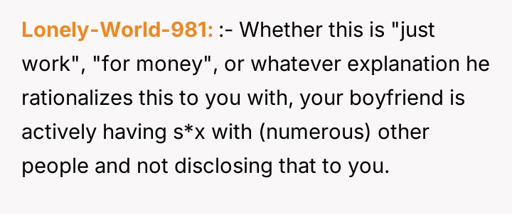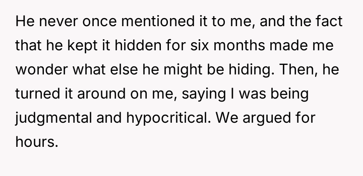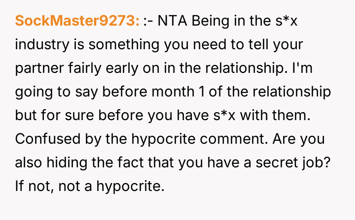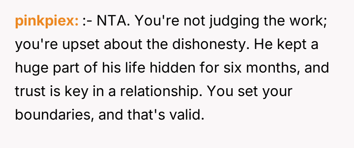 The boyfriend’s motivation for secrecy likely involved anticipating judgment, as evidenced by his defensiveness and immediate accusation that the OP was "judgmental" and "hypocritical" when confronted. This deflection attempts to shift the focus from his deception to her reaction. For the OP, the issue is not necessarily the job itself, but the six months of active concealment. In modern dating, the expectation for core life facts—including major sources of income or profession—to be shared is standard for building intimacy. Hiding such a significant life aspect invalidates the shared reality the couple built.