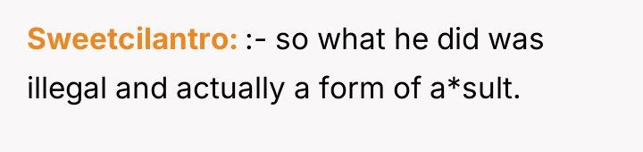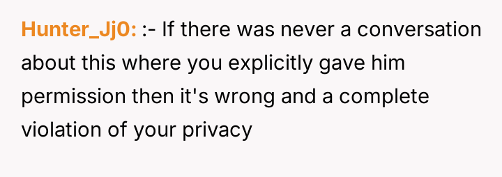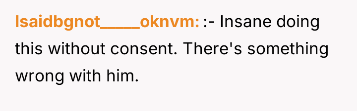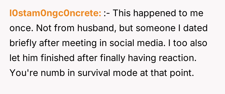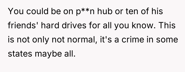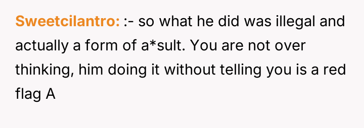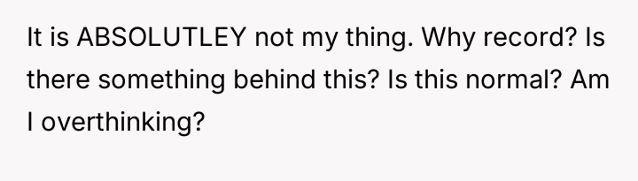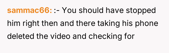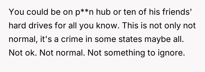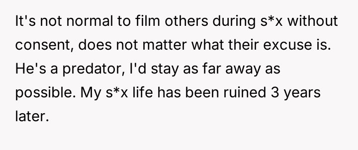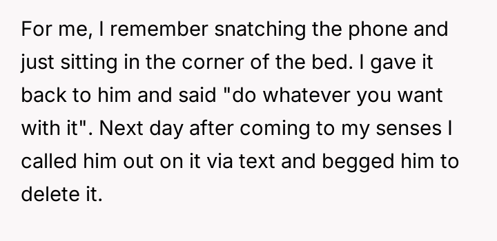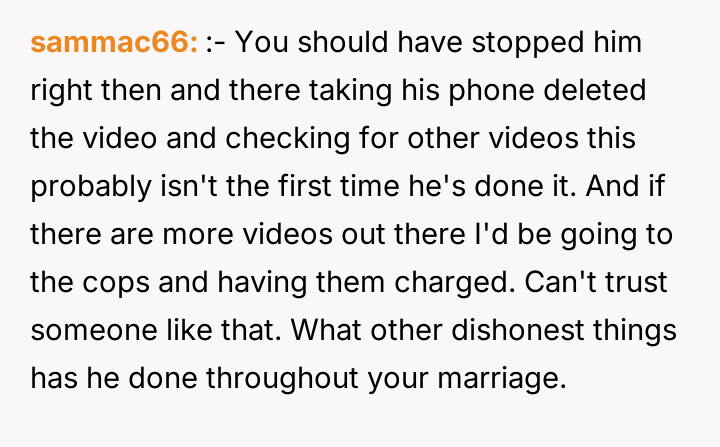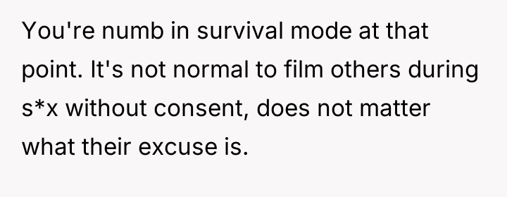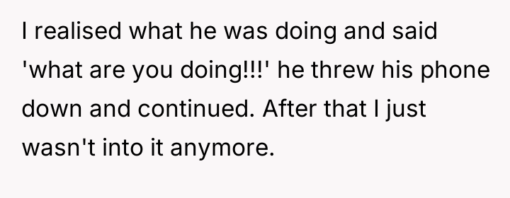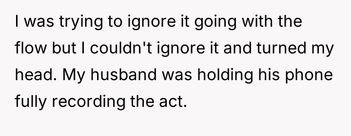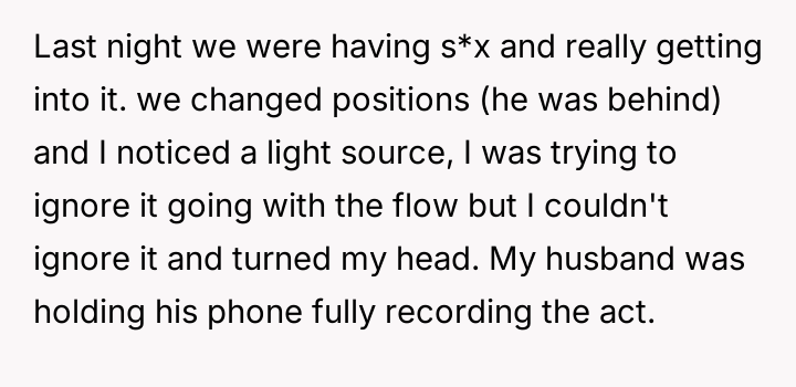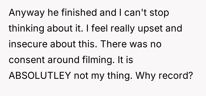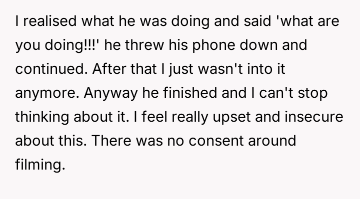 The situation described involves a severe violation of sexual boundaries and explicit consent. Sexual activity requires mutual agreement on all actions, and recording without prior, enthusiastic consent is a fundamental breach of trust. The husband's action—continuing the act after being confronted—suggests an immediate prioritization of his own impulse over his partner's distress and bodily autonomy. The OP's reaction of becoming instantly detached and feeling insecure is a normal, healthy response to having a deeply private moment involuntarily documented.