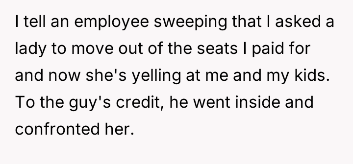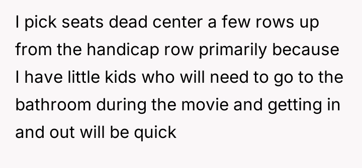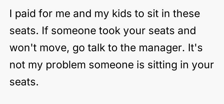 The original poster (OP) felt compelled to defend the seats they had specifically selected and paid for, leading to a direct confrontation with another family who occupied them. The conflict centered on the OP's insistence on asserting their right to the reserved seating versus the other party's expectation that the OP should passively yield the seats due to the theater being mostly empty.