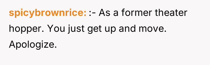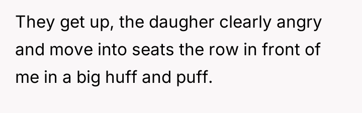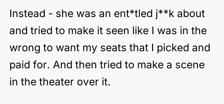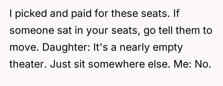 The daughter's motivation appeared rooted in a sense of entitlement or perhaps a social maneuver to control the situation, escalating the disagreement by adopting an annoyed demeanor and public shaming when her initial request was denied. The OP correctly identified the core issue: they had a contractual right to those seats, and shifting the burden onto them simply because the theater was empty negates the purpose of reserved seating. The OP's refusal to back down when challenged—especially after the other party became aggressive—was a necessary assertion of their position.
