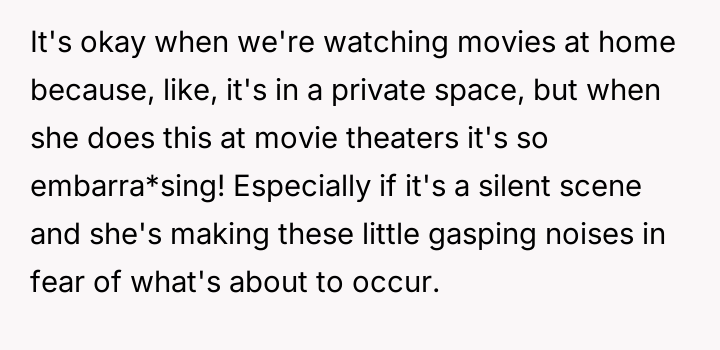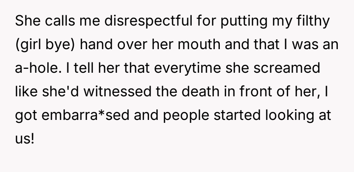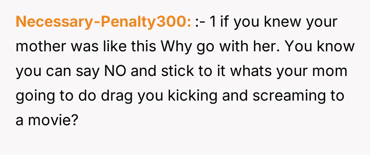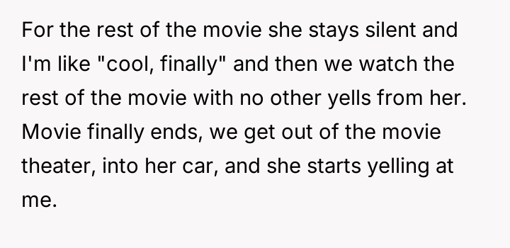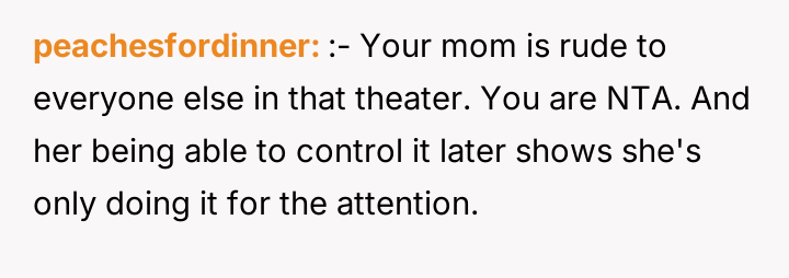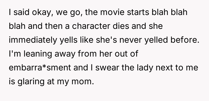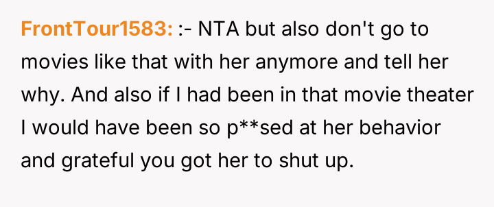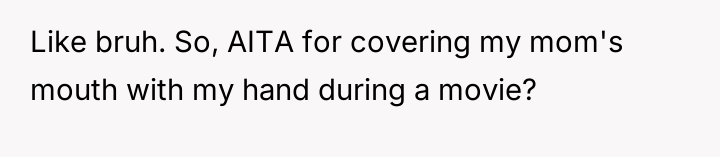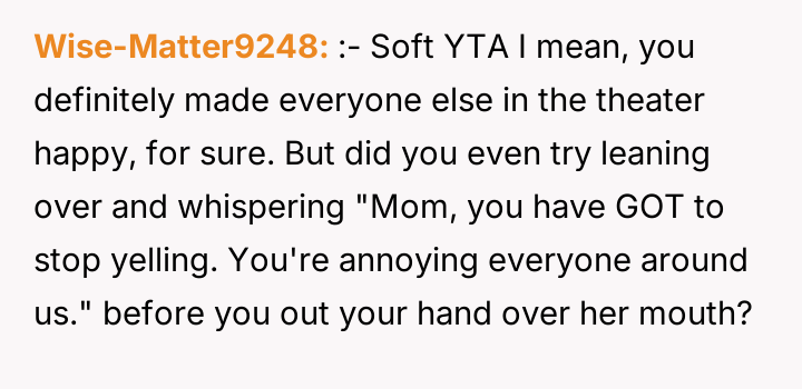 The OP's action was understandable given the persistent nature of the disruption and the prior failure of implicit communication (leaning away). However, the execution was poor. A more constructive approach would have involved a private, pre-agreed boundary setting before attending the movie, or a firm, verbal request during the first instance of screaming (e.g., "Mom, please keep it down, you are disturbing people"). In the future, when setting boundaries with close family in public, assertiveness without physical restraint is generally the preferred route to maintain relationship integrity while addressing the issue.
