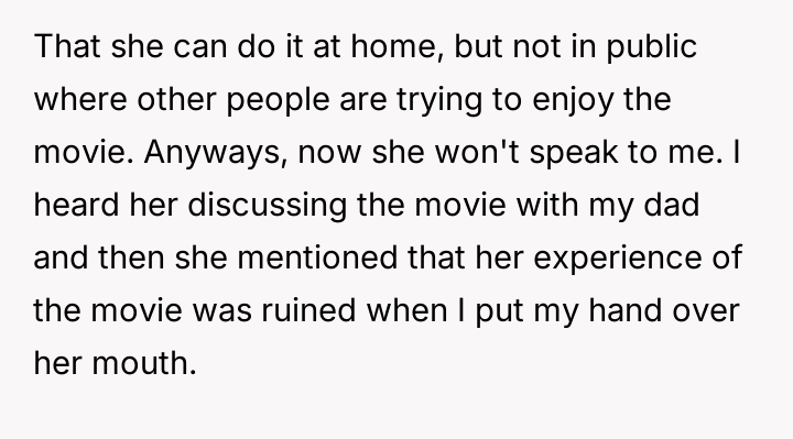 The original poster (OP) faced an embarrassing situation in a public setting due to their mother's extremely loud reactions during a horror movie. The OP acted by physically covering the mother's mouth to stop the disruptive behavior, which resulted in immediate conflict and ongoing silence from the mother, who felt disrespected.