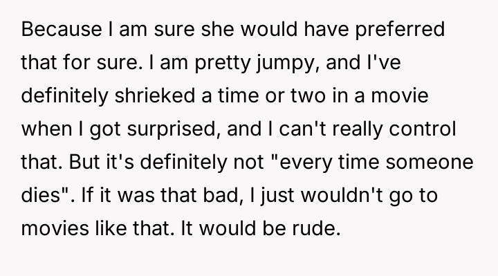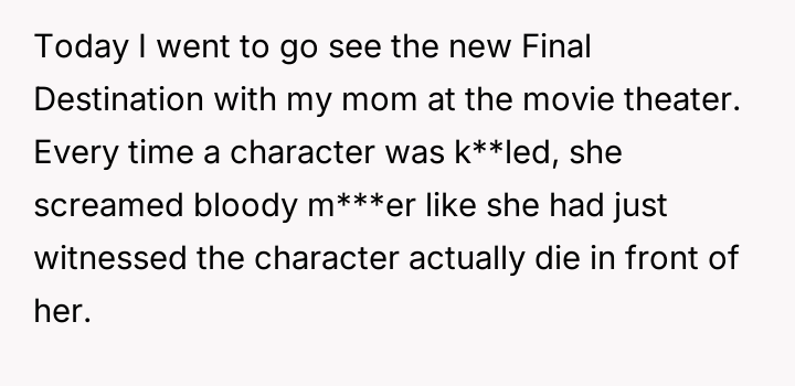 In a dimly lit theater, a son sat nervously beside his mother, bracing himself for a night of heart-pounding terror. His mother’s screams pierced the silence with every chilling death on screen, each outburst a raw, unfiltered expression of fear that made the horror feel all too real. It was a moment that revealed the depth of her fragile courage, even as it filled him with a mix of embarra*sment and empathy.
