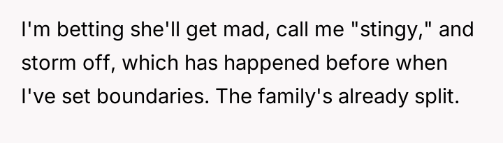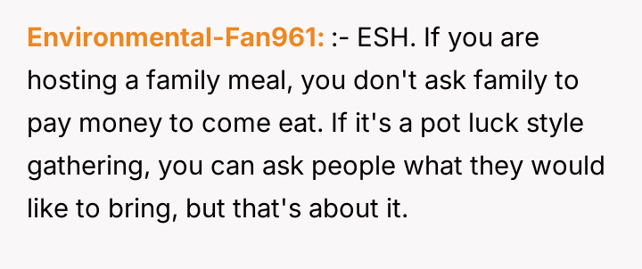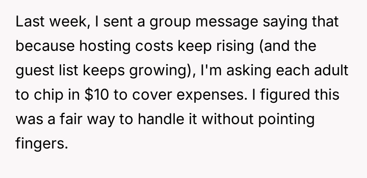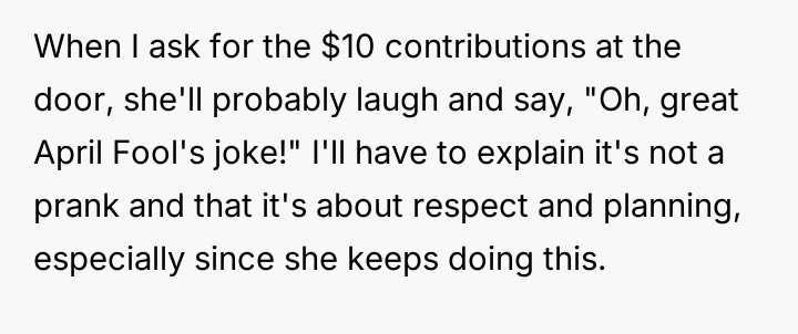 The OP’s decision to implement a $10 contribution is a direct, albeit belated, attempt to enforce a boundary related to resources and planning. While the aunt’s reaction—labeling the OP as 'stingy' or dismissing it as an 'April Fool's joke'—is a predictable defense mechanism intended to deflect responsibility and maintain control, the OP’s frustration is rooted in the lack of respect for their effort. The core issue is not the $10, but the pattern of disregarding the host's needs.