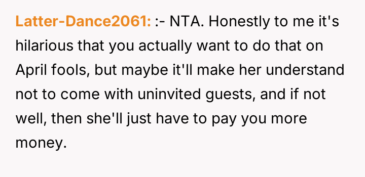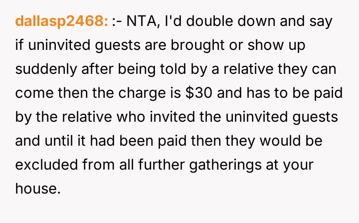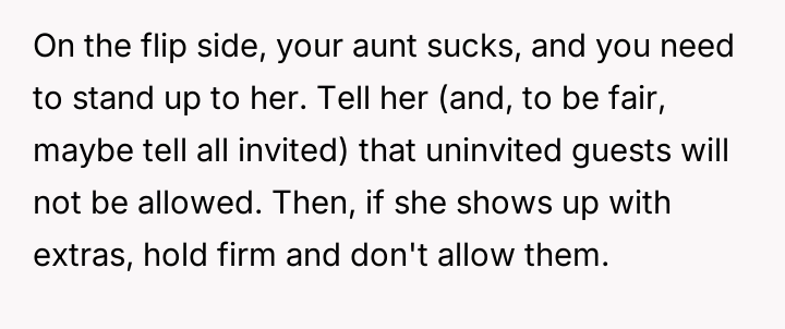 The OP’s action, while potentially disruptive, was appropriate as a last resort when polite requests failed; however, the execution was complicated by the April 1st timing, which provided the aunt an easy out. Moving forward, the OP should address the uninvited guests issue separately from the financial contribution. A constructive path would be to firmly state that future gatherings require prior notice for all attendees, and if the aunt arrives with unannounced guests, they will need to be accommodated separately or politely declined entry.