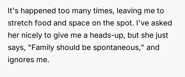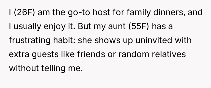 As renowned researcher Dr. Brené Brown explains, “Boundaries are the distance at which I can love you and me simultaneously.” This situation highlights a critical failure in establishing and maintaining functional interpersonal boundaries. The OP has consistently enjoyed the role of host but has allowed the aunt to repeatedly violate the unspoken agreement of responsible hosting by bringing uninvited guests, forcing the OP to absorb increased costs and labor.
