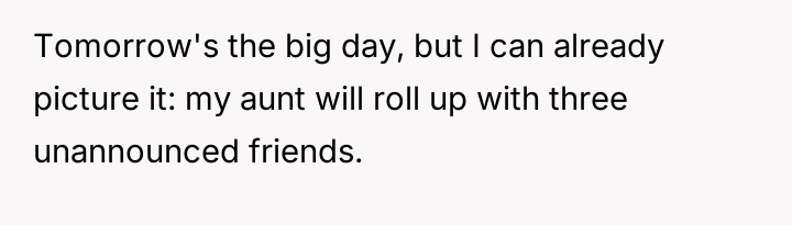 In the quiet anticipation of a family anniversary dinner, a young woman braces herself against the familiar tide of chaos brought on by her aunt's uninvited guests. Despite her efforts to create a warm, well-prepared gathering, the repeated disregard for her boundaries chips away at her patience and peace.