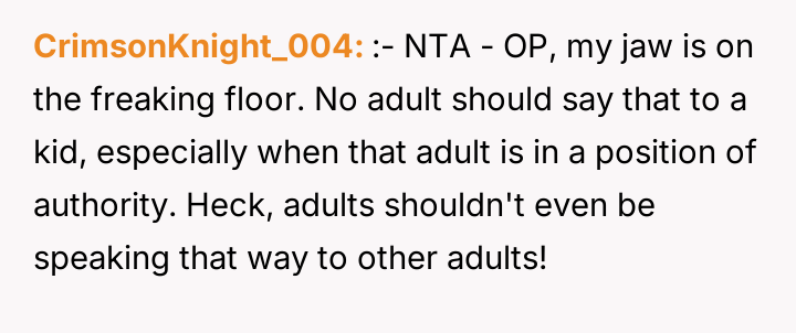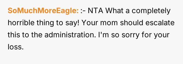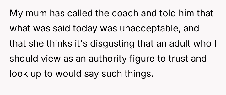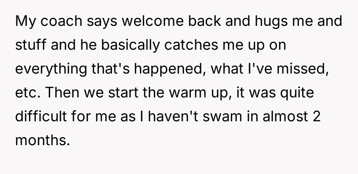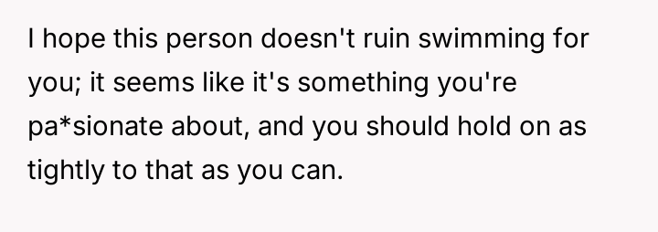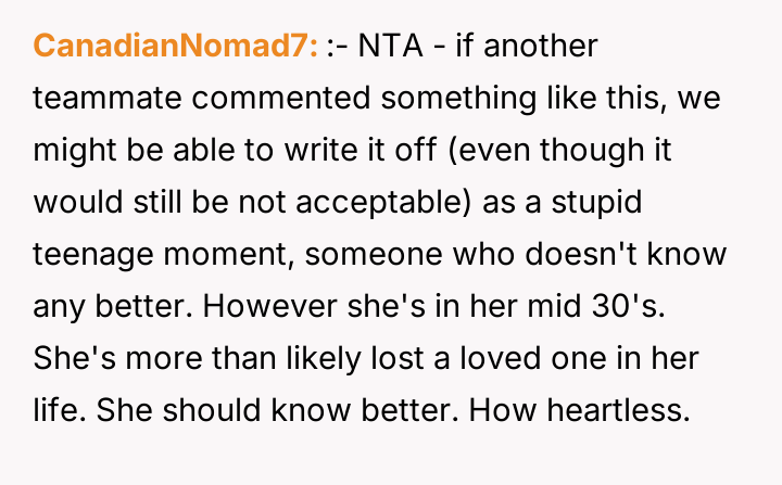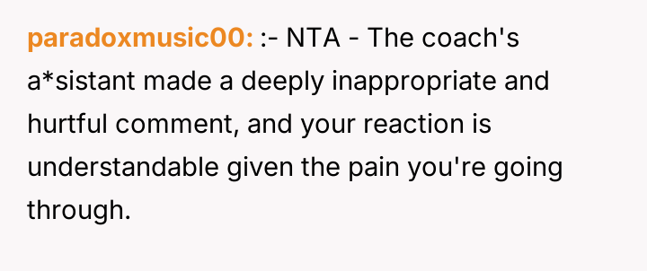 The coach's assistant displayed a profound lack of emotional intelligence and professional boundary maintenance. Her statement trivializes the OP's loss by framing it against the inconvenience of a swim practice, revealing poor judgment and a failure to understand the gravity of the situation, especially concerning a vulnerable individual who is grieving. The OP's reaction—fuming and leaving—is a natural, though perhaps impulsive, defense mechanism against emotional trauma; they established an immediate boundary when the professional authority figure failed to uphold one. The mother's subsequent action of contacting the coach was an appropriate escalation, seeking accountability for the harmful environment created by the staff member.