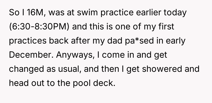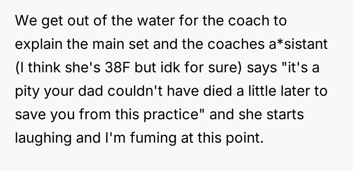 The original poster (OP) is dealing with the fresh grief of losing their father while attempting to return to normal activities like swim practice. The central conflict arises when a coach's assistant makes an extremely insensitive and inappropriate comment regarding the timing of the father's death relative to the difficult practice, causing the OP significant emotional distress and prompting them to leave early.