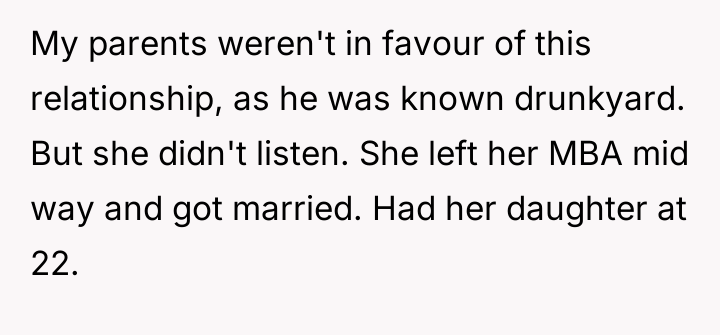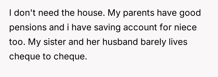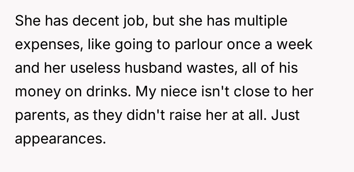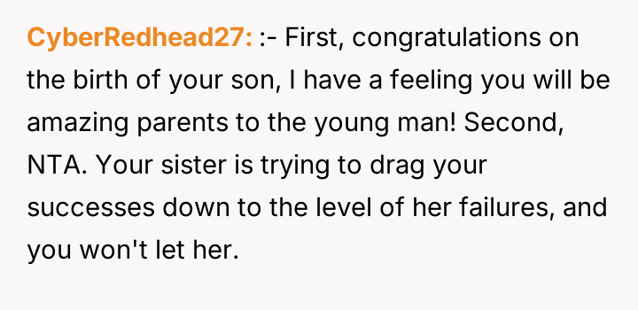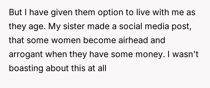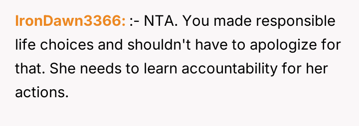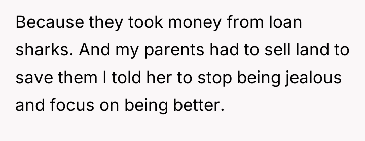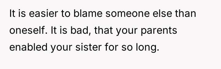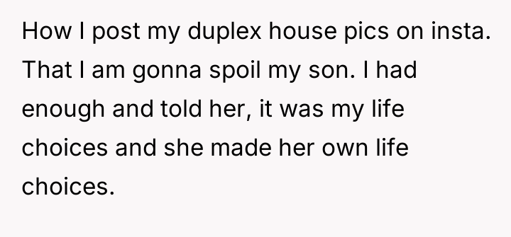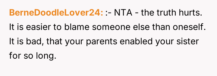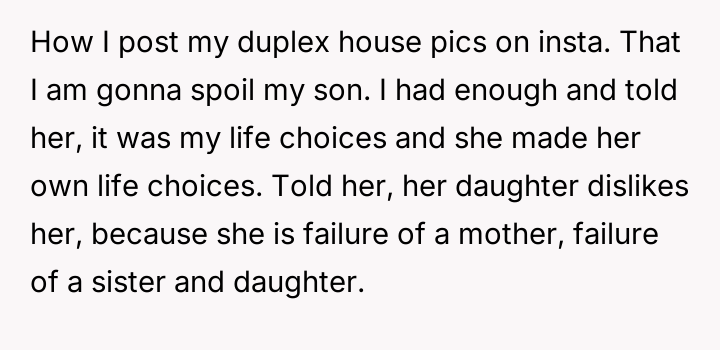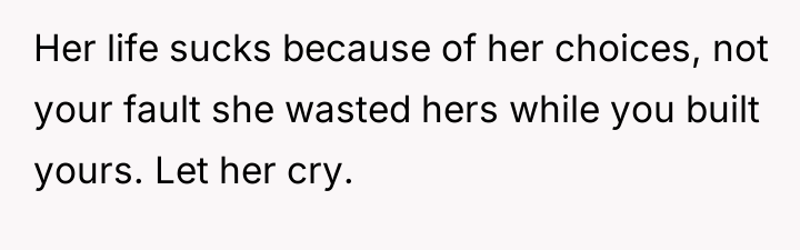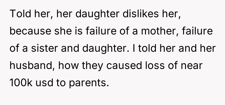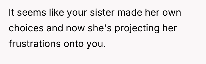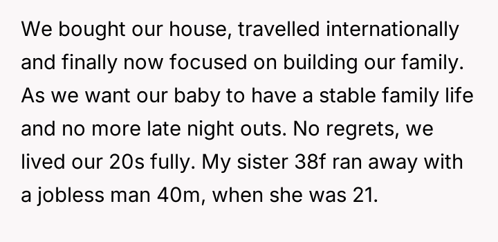 The OP’s decision to detail her sister’s perceived failures (financial irresponsibility, marital deceit, and perceived maternal failure) while defending her own choices served as a massive boundary enforcement, but it was delivered using destructive communication. While the OP is correct that she and her husband have achieved their goals through different choices, attacking the sister's life choices directly—especially concerning her daughter—is often counterproductive. The sister’s behavior (bitter remarks, social media posts) suggests profound envy and insecurity stemming from her early choices and continued financial strain, exacerbated by her parents' enabling behavior.