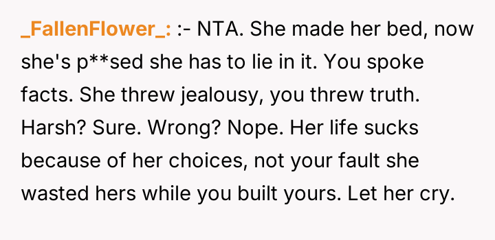 The original poster (OP) feels justified in confronting her sister after enduring repeated, bitter remarks aimed at her successful life and parenting choices. The central conflict lies between the OP's need to defend her boundaries and the sister's reaction rooted in deep-seated resentment and perhaps feelings of failure regarding her own life decisions and reliance on their parents.