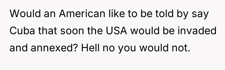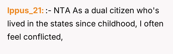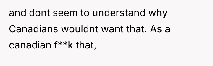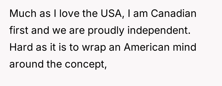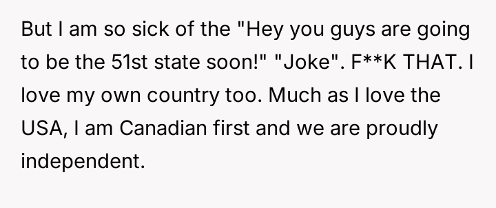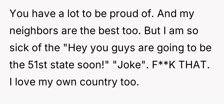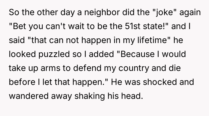 The original poster (OP) expressed strong affection for the USA while simultaneously feeling deeply insulted by persistent jokes suggesting Canada should become the 51st state. The central conflict arose when the OP reacted to a seemingly lighthearted comment with a stark statement about defending Canadian sovereignty, causing shock and confusion for the neighbor.