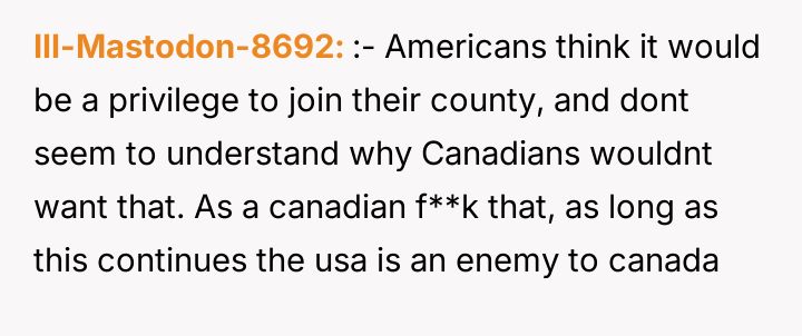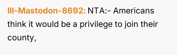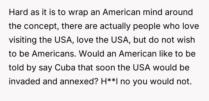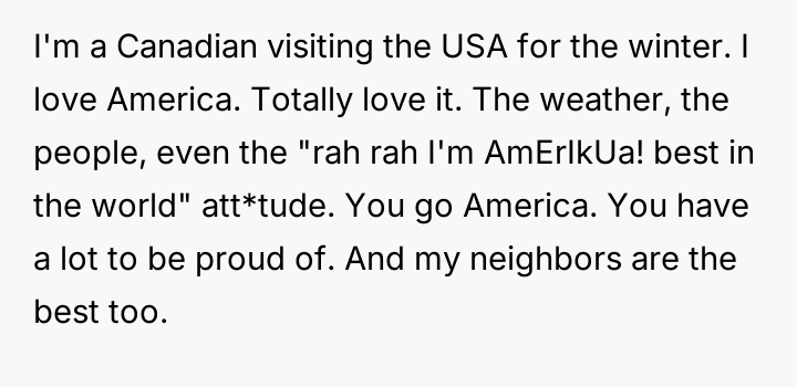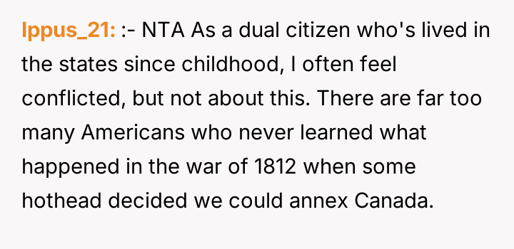 The OP clearly values both their current positive experience in the USA and their fundamental identity as a proud Canadian. The neighbor’s repeated comment, while likely intended as friendly banter rooted in perceived American exceptionalism, repeatedly crossed a boundary related to national sovereignty and identity. The OP's emotional response—culminating in the statement about taking up arms—suggests a deep, perhaps undervalued, emotional investment in their national pride. For the neighbor, this was likely a low-stakes joke; for the OP, it was a high-stakes dismissal of their identity. The shock the neighbor displayed indicates a complete failure to understand the weight the comment carried for the visitor.