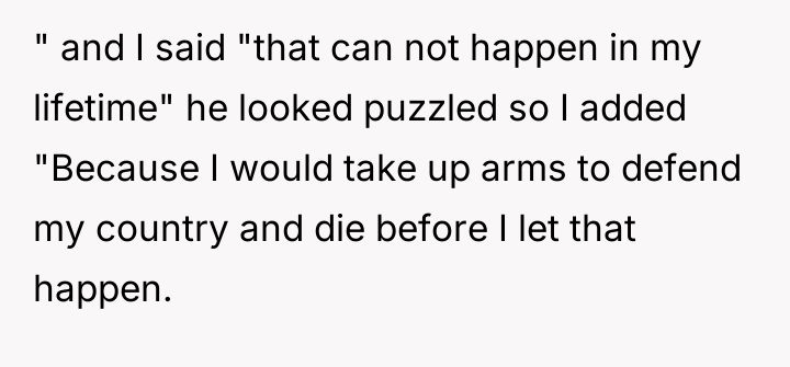 When a neighbor casually jests about Canada becoming the 51st state, the visitor’s quiet pride erupts into a powerful declaration: they would fight and die before ever surrendering their homeland. In that moment, the line between friendly banter and deep allegiance becomes painfully clear—love for a country isn’t a joke, and defending one’s sovereignty is a sacred vow.