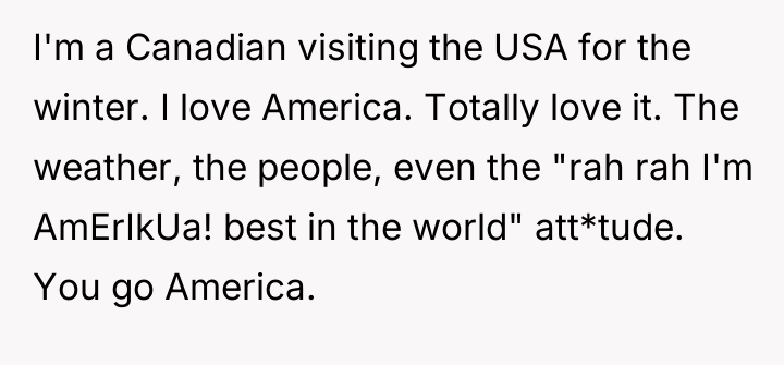 A Canadian visitor to the USA finds themselves caught between admiration and frustration. They cherish everything about America—the vibrant spirit, the warmth of its people, the proud, unyielding att*tude—but face a constant, dismissive "joke" that threatens their national ident*ty. Despite their love for the States, their heart beats fiercely for Canada, a country they hold sacred and fiercely independent.