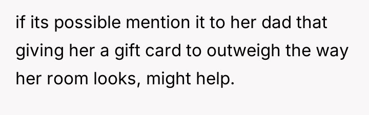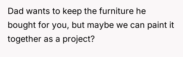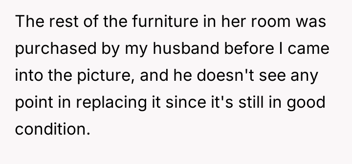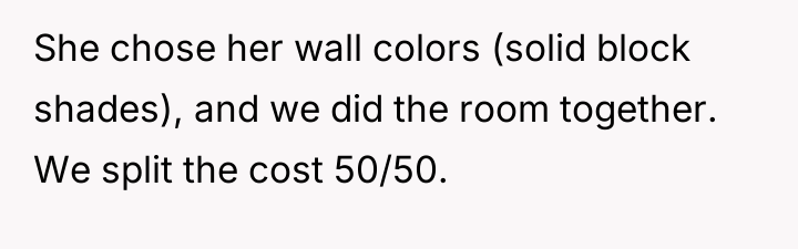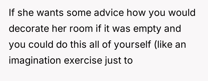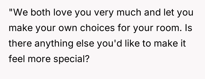 The OP’s actions were appropriate in terms of respecting the initial defined role, but the execution created an unfortunate emotional consequence. Moving forward, the OP should initiate a new conversation with the stepdaughter, focusing specifically on the shared space. A constructive recommendation is to frame future investment not as 'parenting' but as an act of relationship-building. This could involve jointly selecting one significant, dedicated element for the stepdaughter’s side of the room (perhaps a new piece of furniture or décor that reflects *her* taste) that is entirely funded by the OP, thereby demonstrating personal care without altering the existing furniture or overriding her role as an advocate.