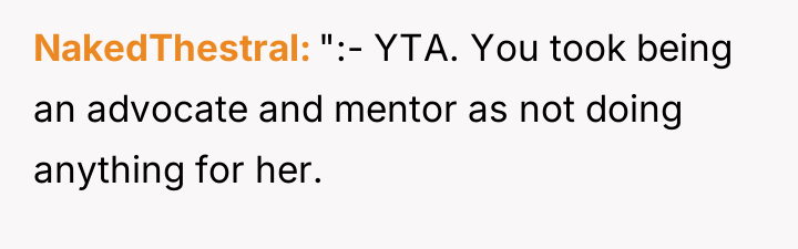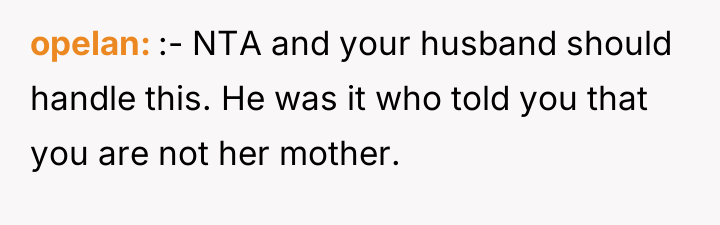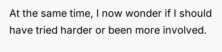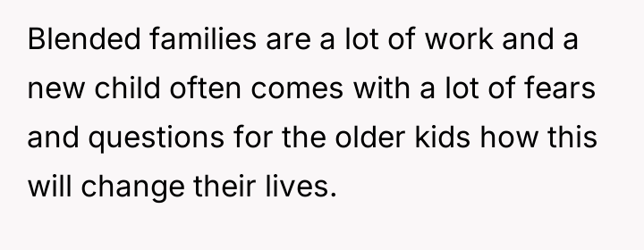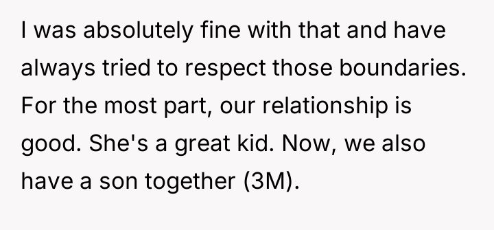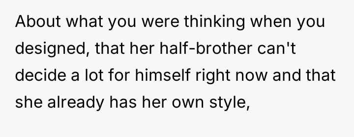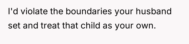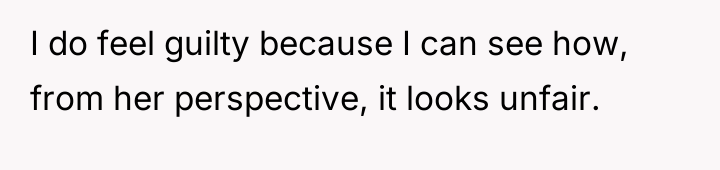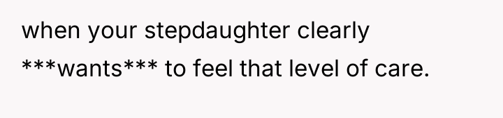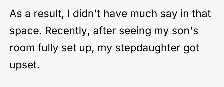 The OP’s motivation to respect the initial agreement—that she would be an advocate, not a replacement parent for her 13-year-old stepdaughter—is understandable and directly addresses the husband’s stated wishes. However, children, particularly adolescents, process care and commitment through tangible demonstrations of effort and investment. The OP invested significant personal resources (time, money, vision) into her biological son's room, while the stepdaughter's space resulted from a collaborative, cost-split effort where the existing, older furniture remained. From the stepdaughter’s perspective, the tangible result signals a hierarchy: the new child receives the full, custom expression of the stepmother's care, while she receives shared, older elements. This inadvertently violates the emotional boundary of feeling valued within the home, even if it honors the relational boundary of not being 'parented.' The OP's feeling of guilt confirms that the initial boundary structure is now failing to meet the emotional requirements of the relationship.