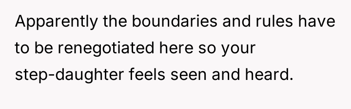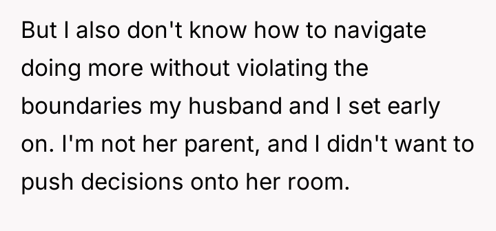 Given that the stepdaughter perceives the OP's deliberate restraint as a form of rejection, the core question remains: Should the OP prioritize maintaining the original 'advocate' boundary by respecting the stepdaughter's input, or should she now actively override that boundary by heavily investing in the shared space to mitigate the perception of parental favoritism toward her biological child?