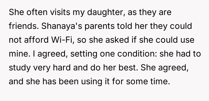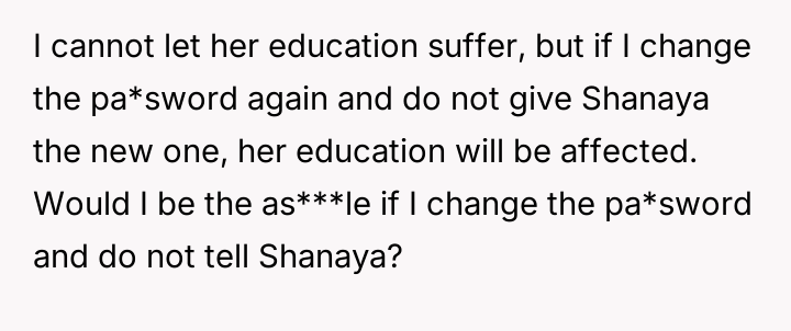 Should the OP maintain the agreement by sharing the new password with Shanaya, risking their daughter's connectivity, or should they prioritize their own child by withholding the password entirely? The core question remains: When sharing a limited resource under specific conditions, is it justifiable to revoke access completely when the recipient's family repeatedly violates those conditions?