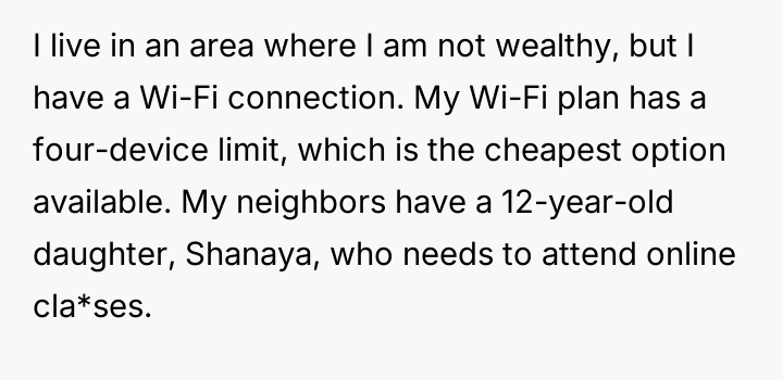 As renowned researcher Dr. Brené Brown explains, “Boundaries are the distance at which I can love you and me simultaneously.” In this scenario, the OP established a clear boundary: the Wi-Fi was for Shanaya's classes, limited to four devices total. The motivation behind the OP's initial action was generosity and community support, but the subsequent actions of the neighbors—sharing the password with their own parents and then another family—represent a significant boundary violation.