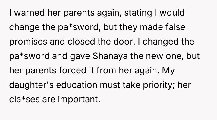 The OP's action of changing the password and then having it forcefully taken again is an escalation signaling that verbal communication has failed. Given the repeated violations, the OP's contemplation of not giving Shanaya the new password is an understandable reaction to protect their own dependent's well-being. A constructive recommendation would be for the OP to communicate firmly one last time, stating that due to multiple service interruptions, the arrangement is temporarily suspended until the parents can guarantee only Shanaya will use the connection. If trust cannot be re-established, they must prioritize their own household's needs without apology.